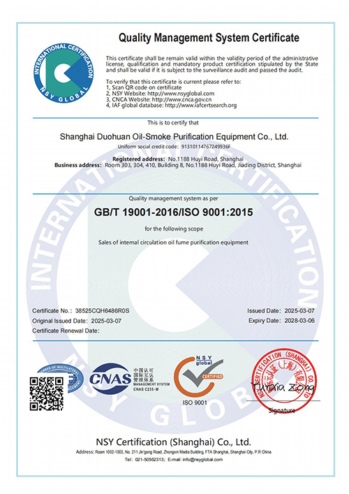 ISO9001認證 是全球公認的質量管理標準,它代表著國際社會對上海多環油煙凈化設備有限公司產品質量的認可,也標志著多環公司在規范化、標準化、國際化的道路上邁出了堅實的一步。