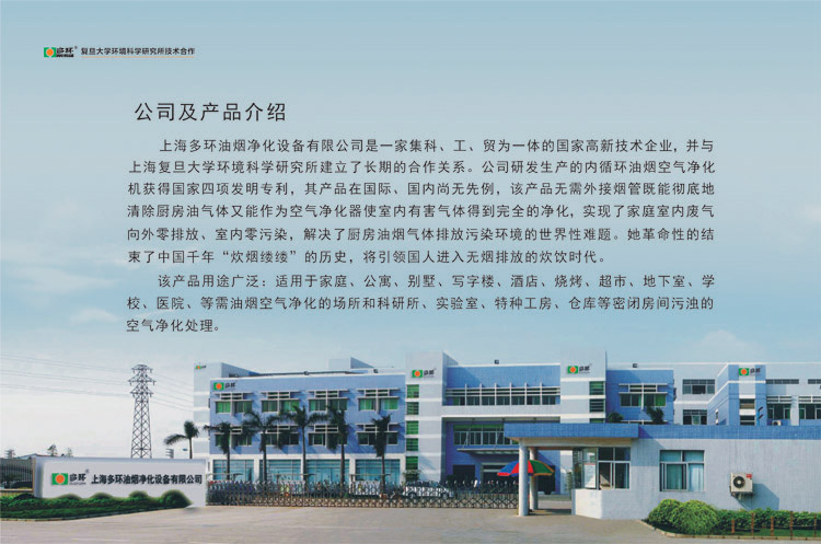 無煙管內循環油煙凈化器是采用高科技手段將廚房及烹飪場所產生的有害氣體在室內進行凈化處理的一種電器設備。目前國內、國際尚無該種設備的先例。上海多環油煙凈化設備有限公司科研團隊從解決社會大氣污染及凈化家庭室內空氣出發經過多年的研究和實驗開發生產出了一種適合國人烹飪需要的不用接煙管向室外排放的內循環油煙凈化器,它的主要特點是將人們廚房生活產生的廢氣通過室內安裝的凈化器進行凈化處理,實現了家庭室內廢氣向室外不排放,室內室外無污染,解決了廚房油煙氣體排放污染環境的世界性難題。